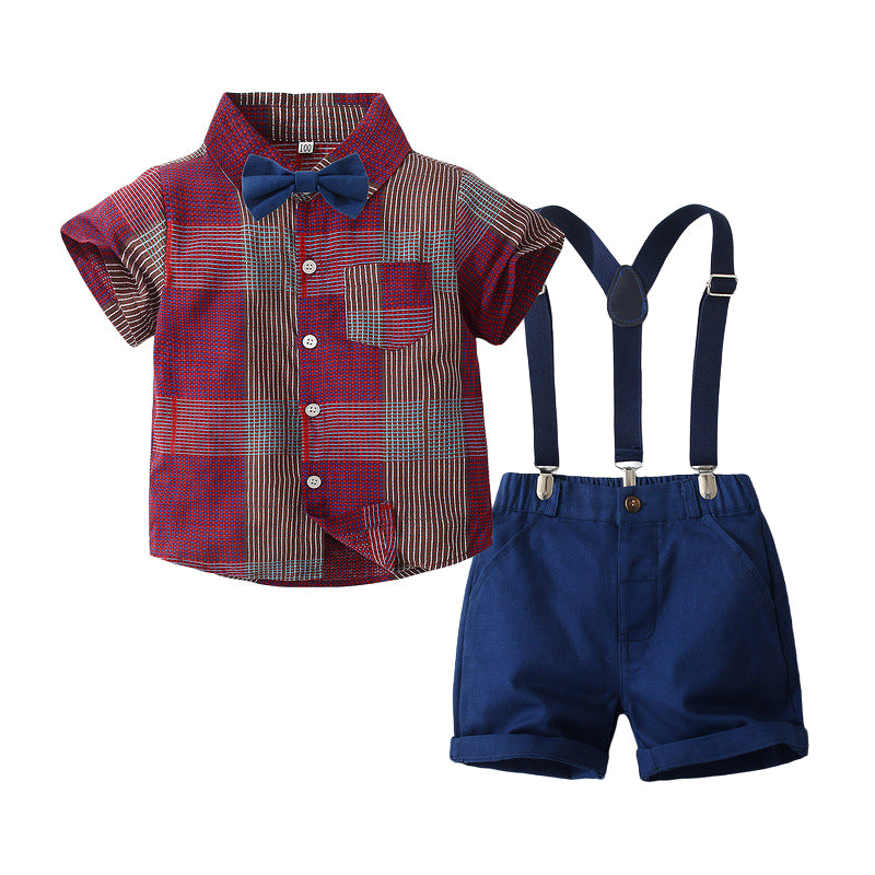 Sku : 221216225Clothing Categories : Clothing Sets,SuitsGender : BoysAge : 12months-5yearsFabric : 95%Cotton BlendColor : WineredSeason : SummerPattern : Solid Color,Checked,BowOccasion : Birthday,Party