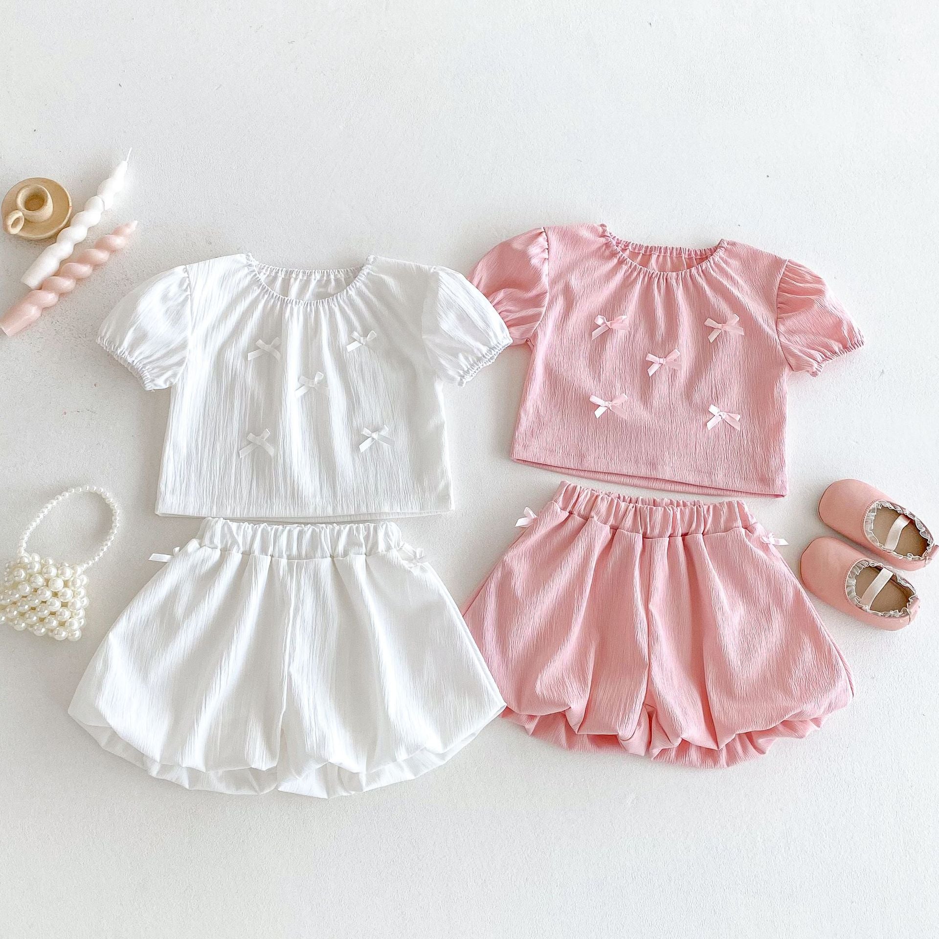 2 Pieces Set Baby Kid Girls Bow Tops And Solid Color Shorts Wholesale 25050879