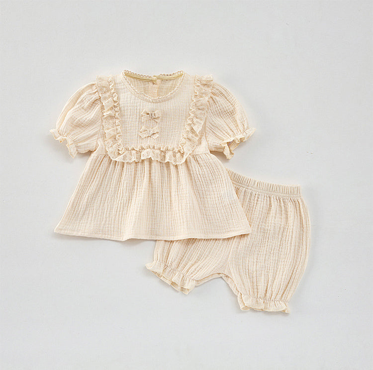Sku : 250227162Clothing Categories : Clothing SetsGender : GirlsAge : 3months-2yearsFabric : Cotton BlendColor : BeigeSeason : SummerPattern : Solid ColorOccasion : Casual