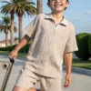 2pcs/Set Tween Boy Casual & Holiday Textured Fabric Polo Shirt With Collar And Zip, Textured Fabric Shorts, Suitable For Outings, Street Photography, Parties, And City Walks