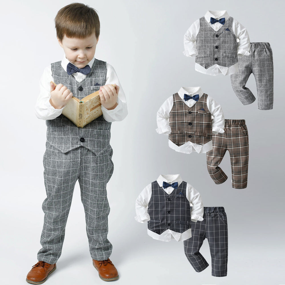 3 Pieces Set Baby Kid Boys Dressy Checked Vests Waistcoats And Solid Color Bow Shirts And Pants Suits Wholesale 230308592