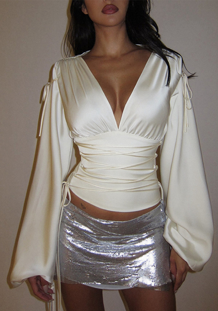 Autumn Long Sleeve Shirt High Elastic Satin Slim Waist Drawstring Women’s Blouse