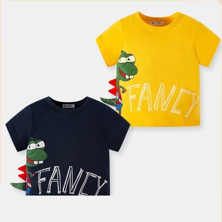 Sku : 24040911Clothing Categories : TopsGender : BoysAge : 18months-7yearsFabric : Cotton BlendColor : Yellow,NavySeason : SummerPattern : Letters,DinosaurOccasion : Casual