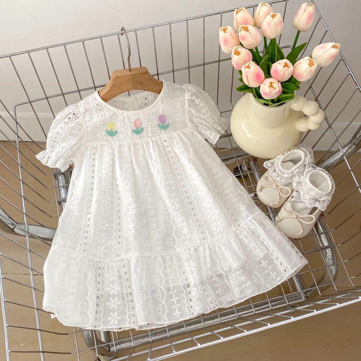 Sku : 240409222Clothing Categories : DressesGender : GirlsAge : 12months-5yearsFabric : Cotton BlendColor : WhiteSeason : SummerPattern : Solid Color,Flower,EmbroideredOccasion : Casual