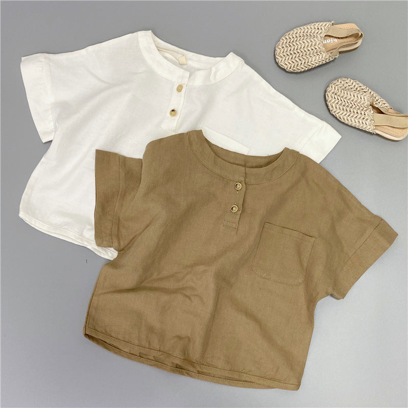 Sku : 220429155Clothing Categories : T-ShirtsGender : UnisexAge : 12months-8yearsFabric : Cotton BlendColor : White,KhakiSeason : SummerPattern : Solid ColorOccasion : Casual