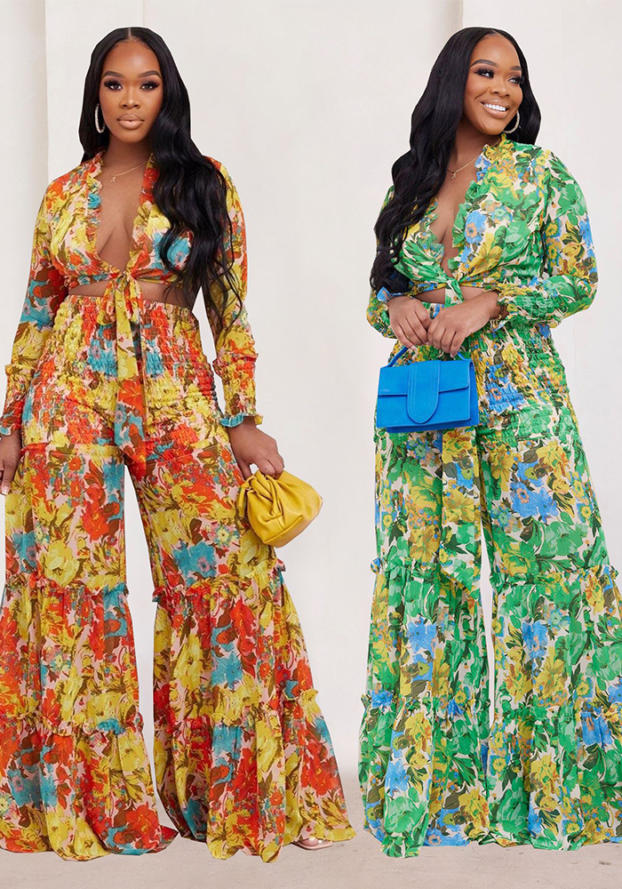 Fashion Color Contrast Printing Chiffon Long Sleeve Tie Blouse Bell Bottom Pants Two-Piece Suit For Women