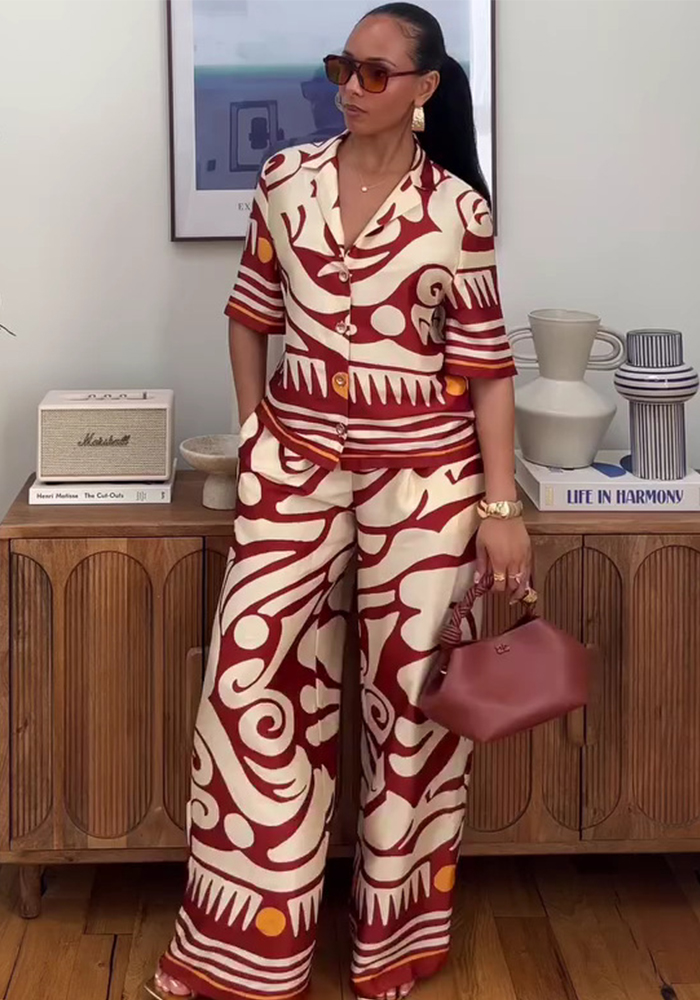 Women Printed Turndown Collar Lace-Up Shirt Wide Leg Pants Two-Piece Set