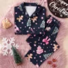 Girls’ Christmas Deer, Christmas Tree, Christmas Gift, Christmas Bow, Gingerbread Element Printed Comfortable Short Sleeve Open Front Collar Loungewear Set, Made Of Flame Retardant Fabric