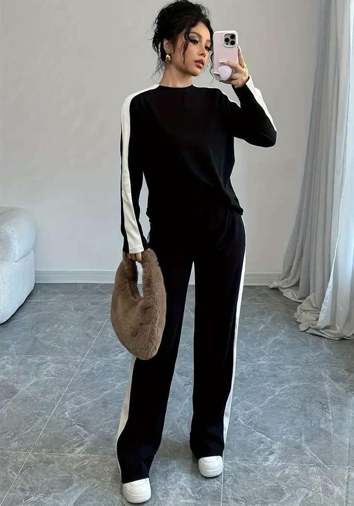 Women Autumn/Winter Ribbed Patchwork Casual Top and Pant Two-Piece Set