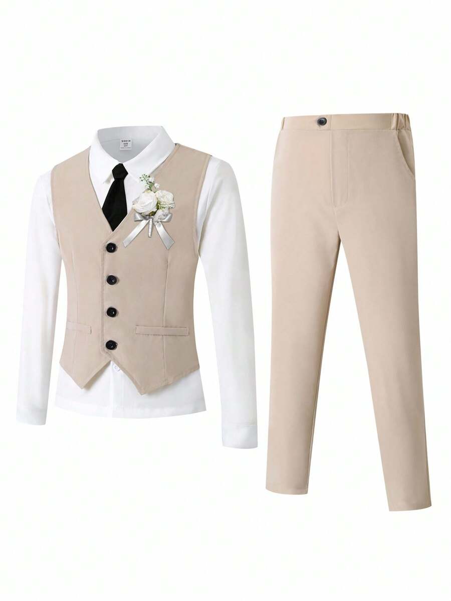 SHEIN 2pcs Tween Boy’s Korean Style Slim Fit Suit, Vest And Pants Set For Spring/Summer, Wedding, Party, Piano Recital, Host Fall Winter
