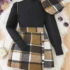 SHEIN 2pcs Tween Girls Solid Stand Collar Puff Sleeve Top And Plaid Skirt Set, Spring Autumn