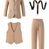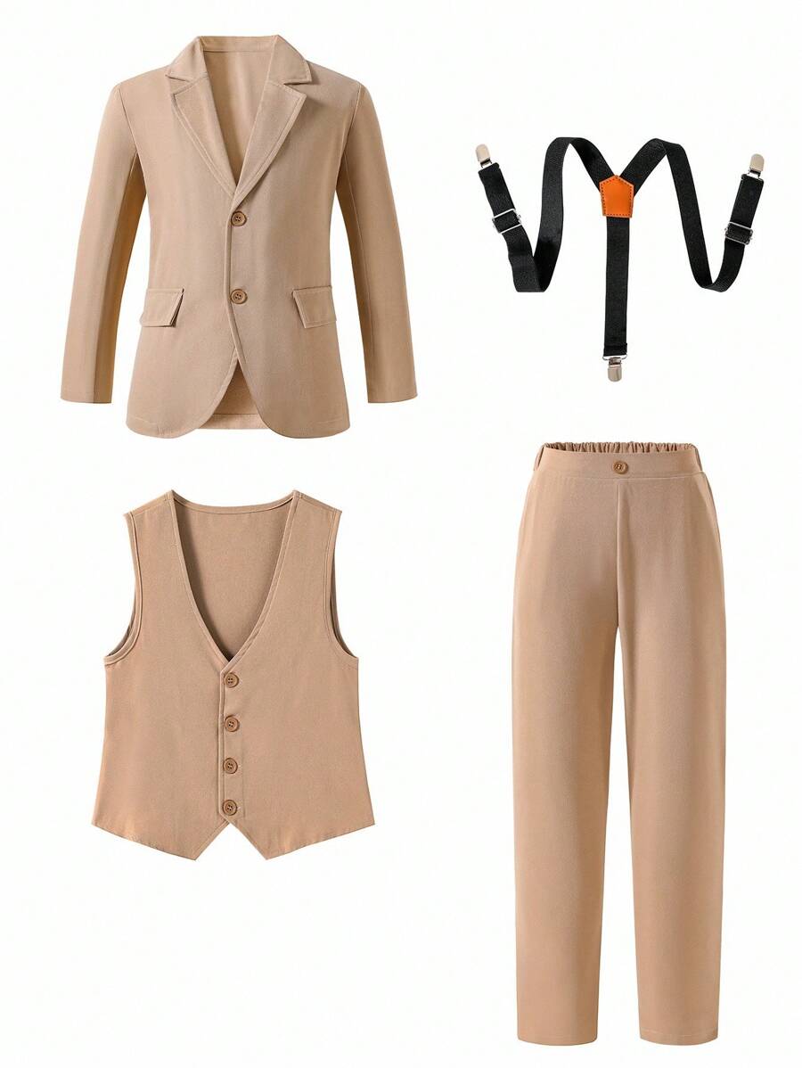 SHEIN 4pcs Tween Boy Gentleman Outfit Set: Khaki Jacket + Khaki Vest + Khaki Trousers + Suspenders, Suitable For Spring/Summer, Elegant & For Valentine’s Day, Birthday Party, Wedding, Christening, Back To School