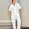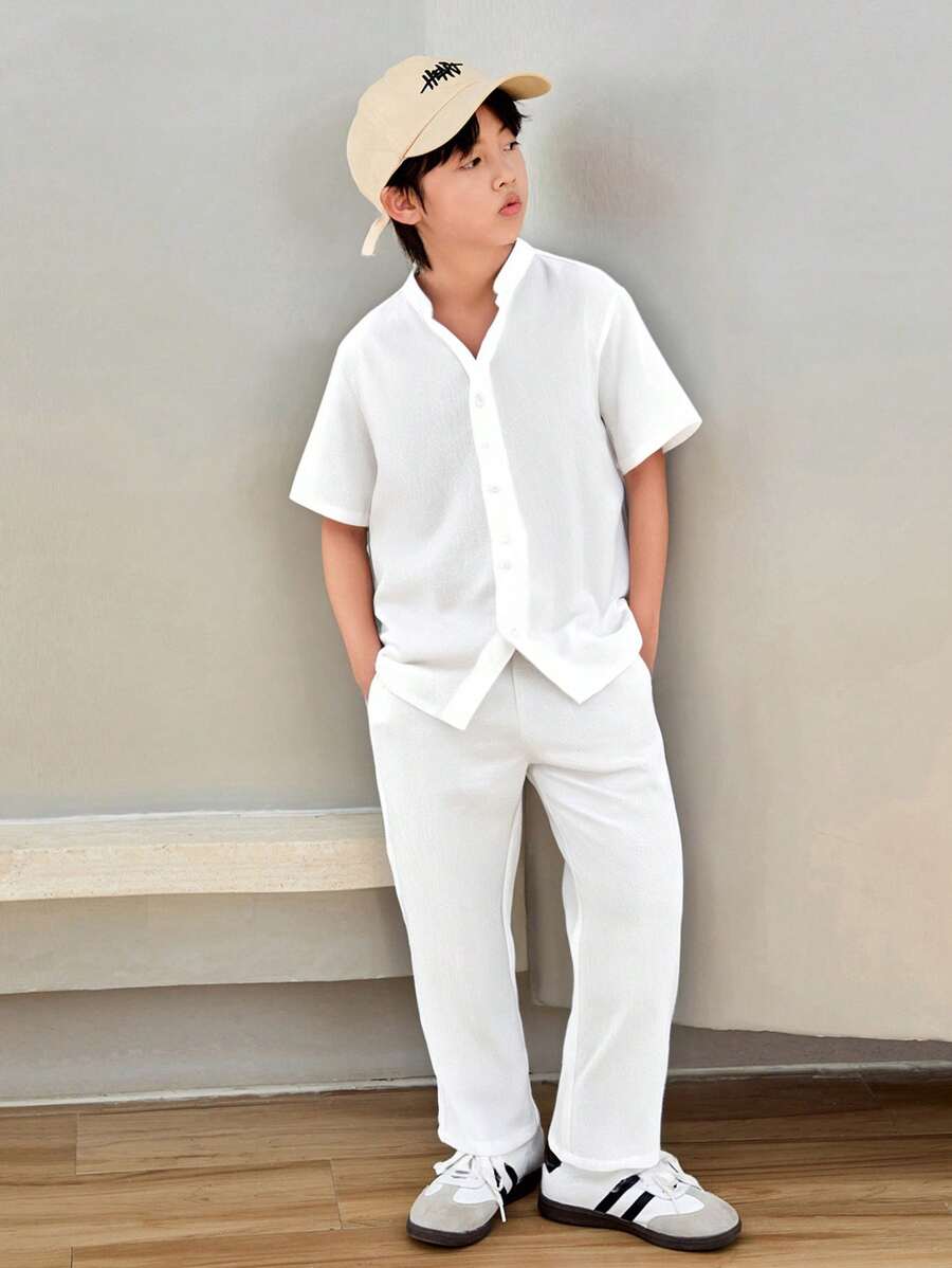 SHEIN Tween Boys’ Loose Fit Casual Solid Color Notched Collar Short Sleeve Shirt And Pants 2pcs/Set
