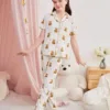 SHEIN Tween Girl Bear Print Shirt & Loose Fit V-Neck Short Sleeve Pants 2-Piece Sleepwear Set