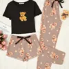 Tween Girl Spring And Summer New Cute Bear Print Shorts And Pants Matching Short Sleeve Top 3-Piece Homewear Set