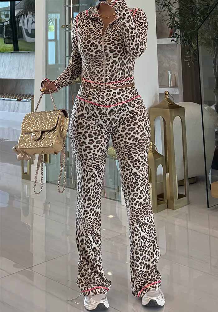 Women Leopard Print Contrast Lettering Zippered Top and Pants Two-Piece Set