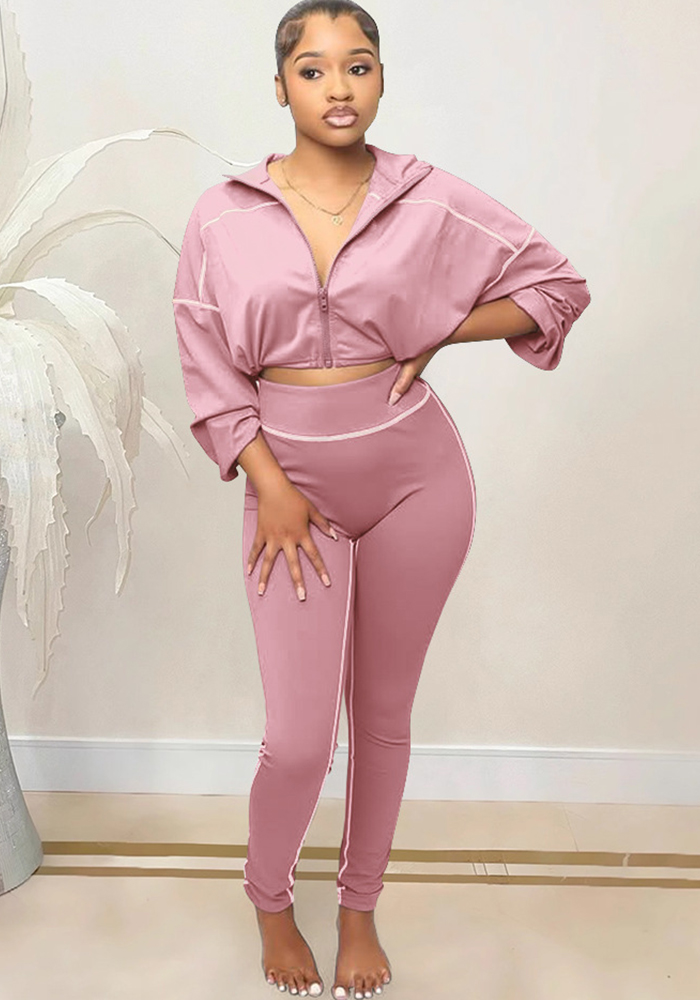 Women’s Fashion Solid Color Sexy Zipper V-neck Long-sleeve Two-piece Pants Set
