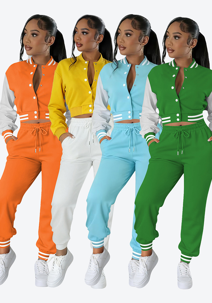 Women contrasting color baseball top and pant two-piece set