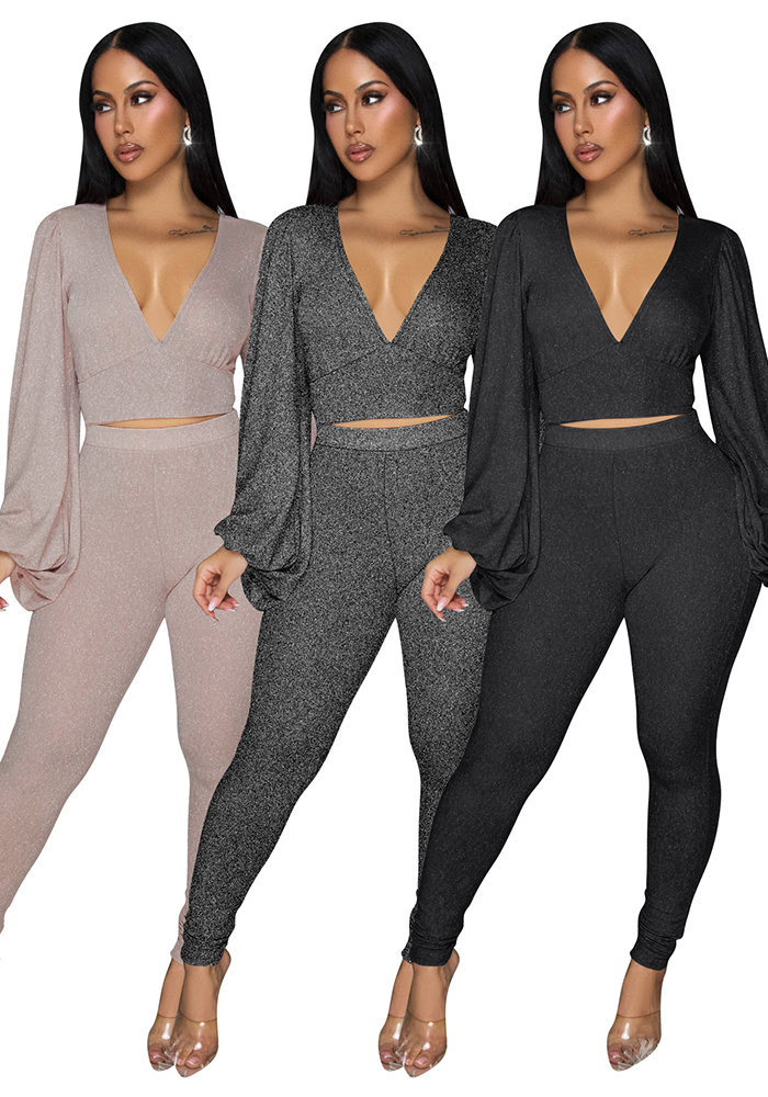 Women Deep V-Neck Backless Lace-Up Short Lantern Sleeve Top and Trousers Two-Piece Set