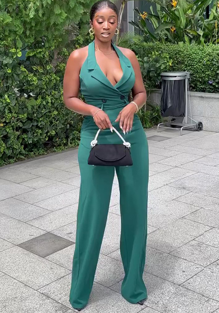 Women’s Solid Color Sexy Low Back Halter Neck Turndown Collar Jumpsuit