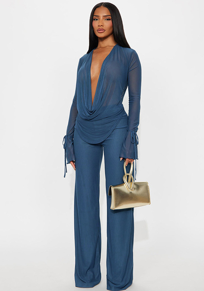 Women Summer Sexy Mesh Long Sleeve Bodysuit and Pants Two-piece Set