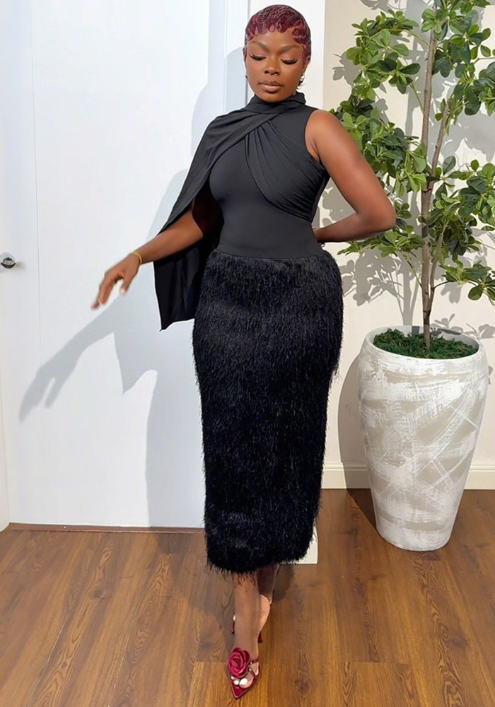 Autumn Women’s Solid Color Chic Elegant Slim Waist Pleated Cowl Neck Slim Fit Long Dress