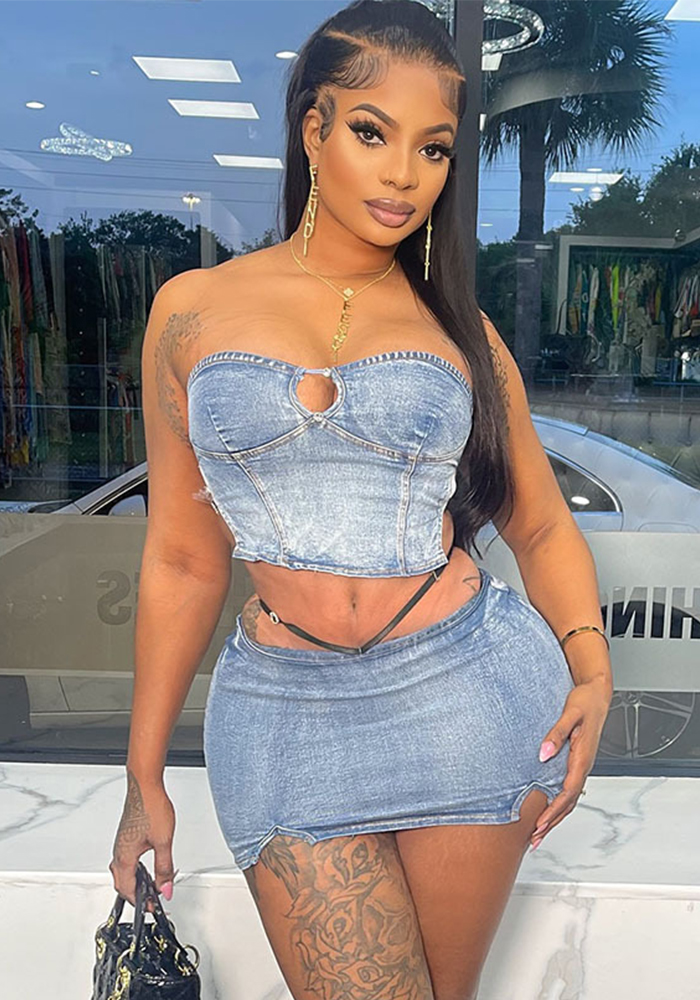 Women Sexy Strapless Denim Top Slit Mini SkirtTwo Piece Set