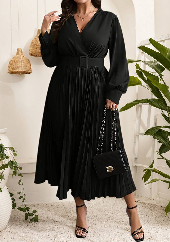 Women’s Autumn Winter V-Neck Flare Plus Size Fashion Casual Belt Slim Waist Pleated Dress